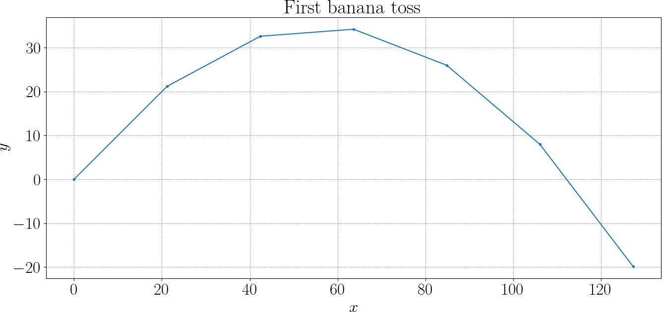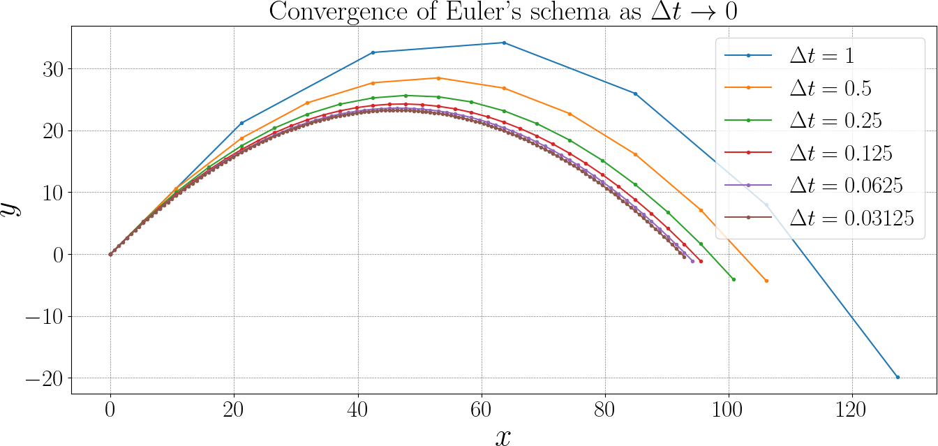 Although this description is approximate, refining the time step will gradually reveal the smooth parabolic path familiar from physics.