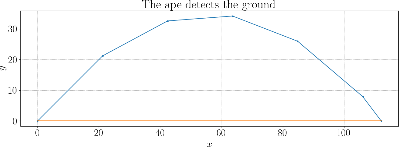 Now the crucial realization: the banana misses the ground after the trajectory has already been computed. The ape already has a polyline. The question is no longer "How do I compute the trajectory?", but "Where, on this polyline, does the banana hit the ground?"
