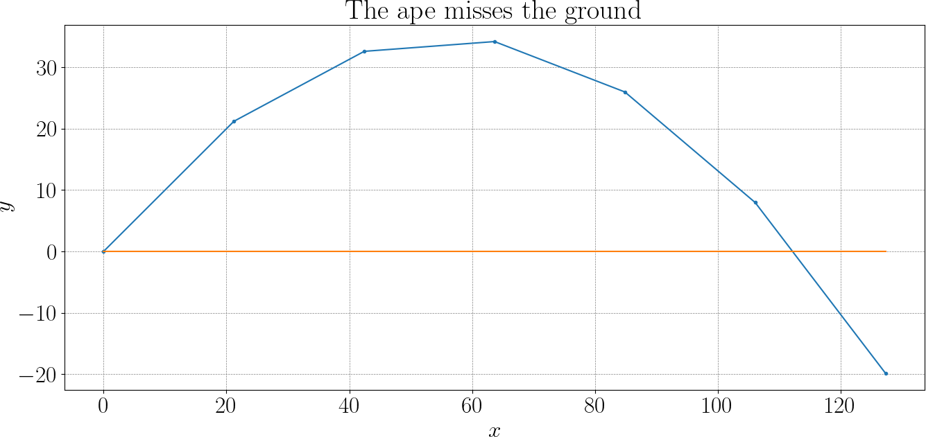 The banana has landed — but the ape did not see it happen. In this simulation, we localized the ground touching event with a simple hack by stopping the simulation as soon as the height becomes negative. In the real world, the banana touches the ground at a precise instant. In the simulation, time advances in jumps, one second at a time. The ape has unknowingly made a strong assumption: