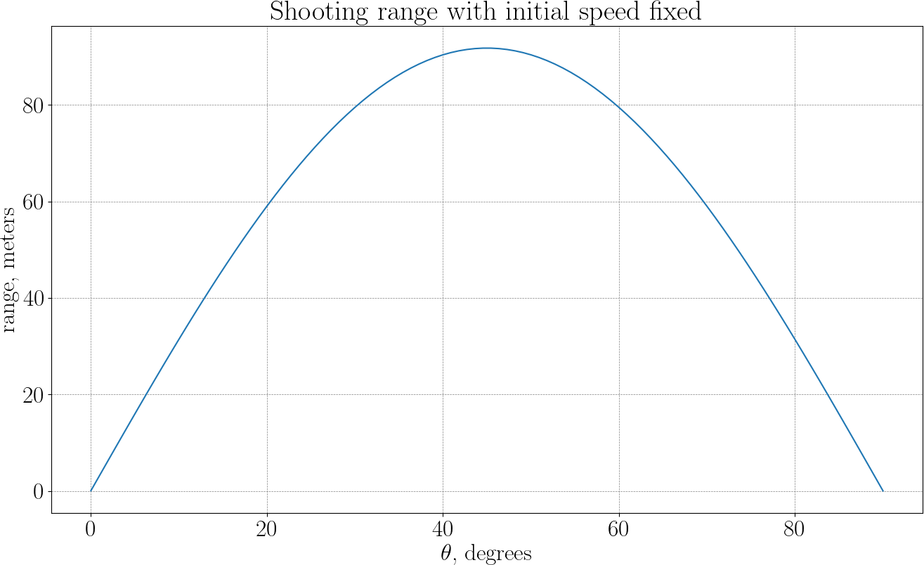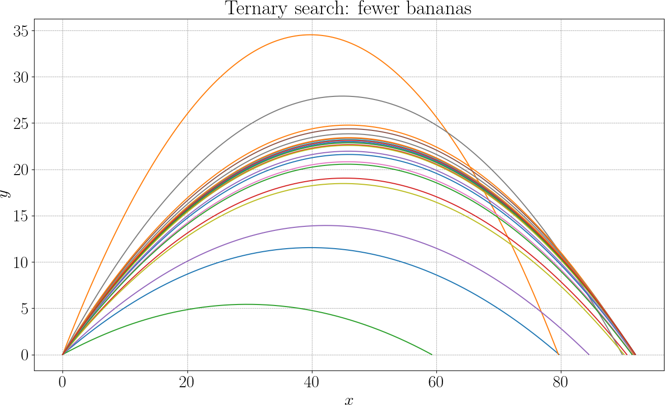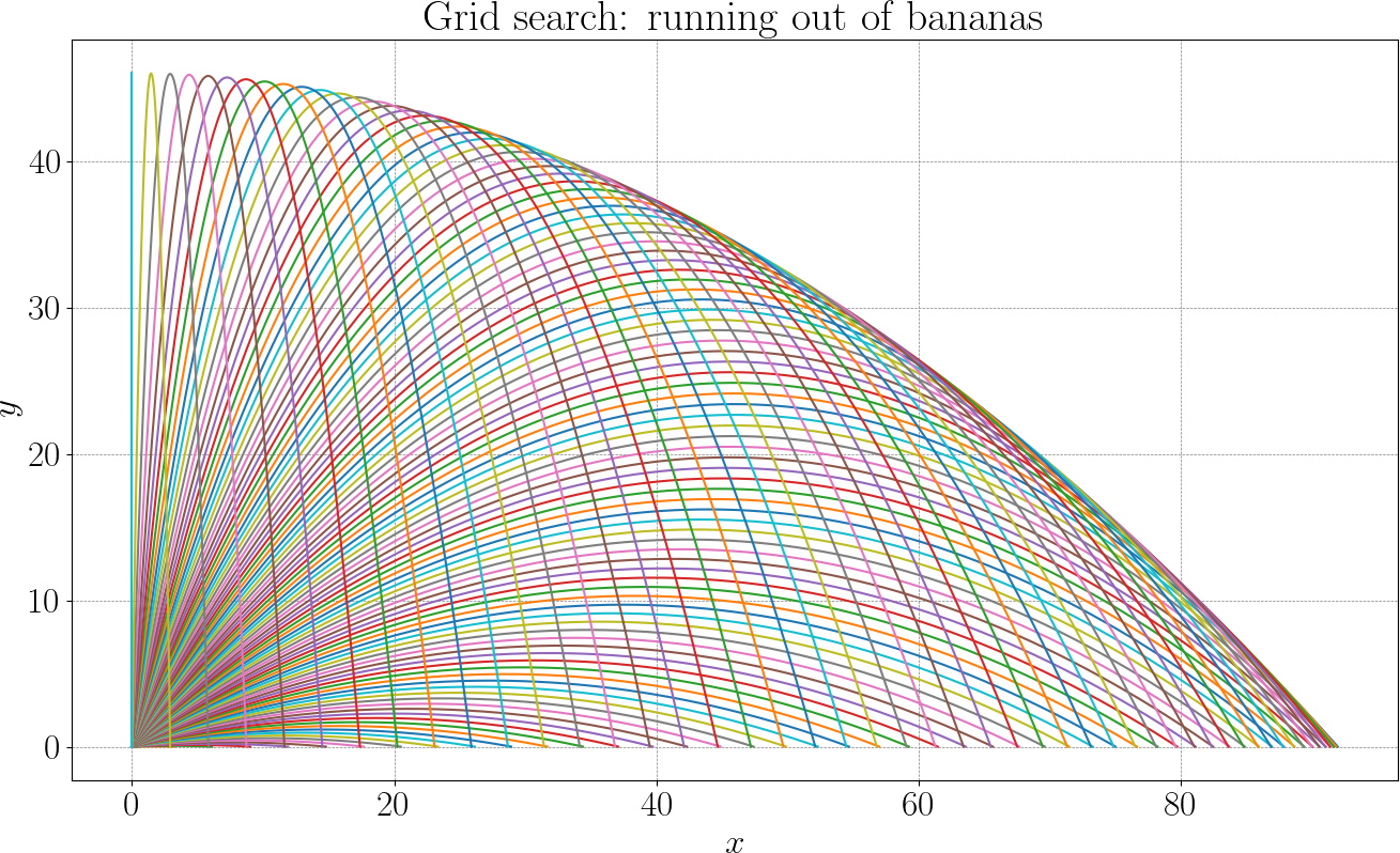 The initial speed \(v_0\) is fixed, only the direction of the throw is allowed to vary. This reduces the problem to a single parameter: the launch angle \(\theta\). For any given angle the banana is simulated forward in time, detecting the landing point. Thus, range depends on \(\theta\). We want to solve the following problem: